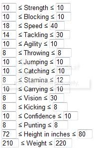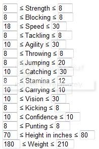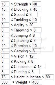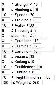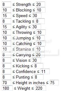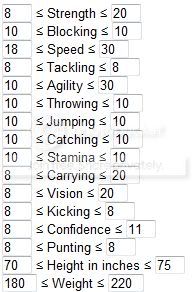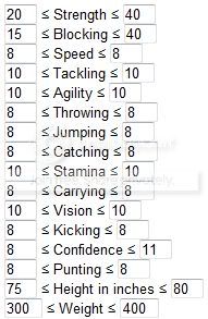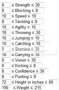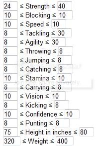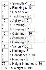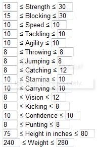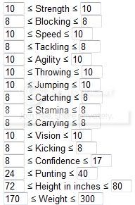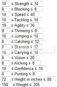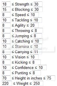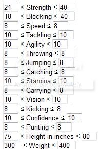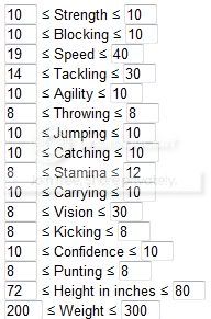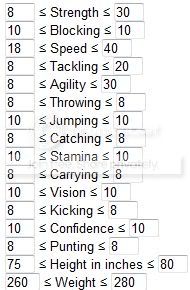 You should also link to the Min/Max rolls for each player type. Like for my rushing QB: because speed and agility are 10s, I want to either max out Strength or Vision depending on if I am going for an elusive rushing or a power rushing.